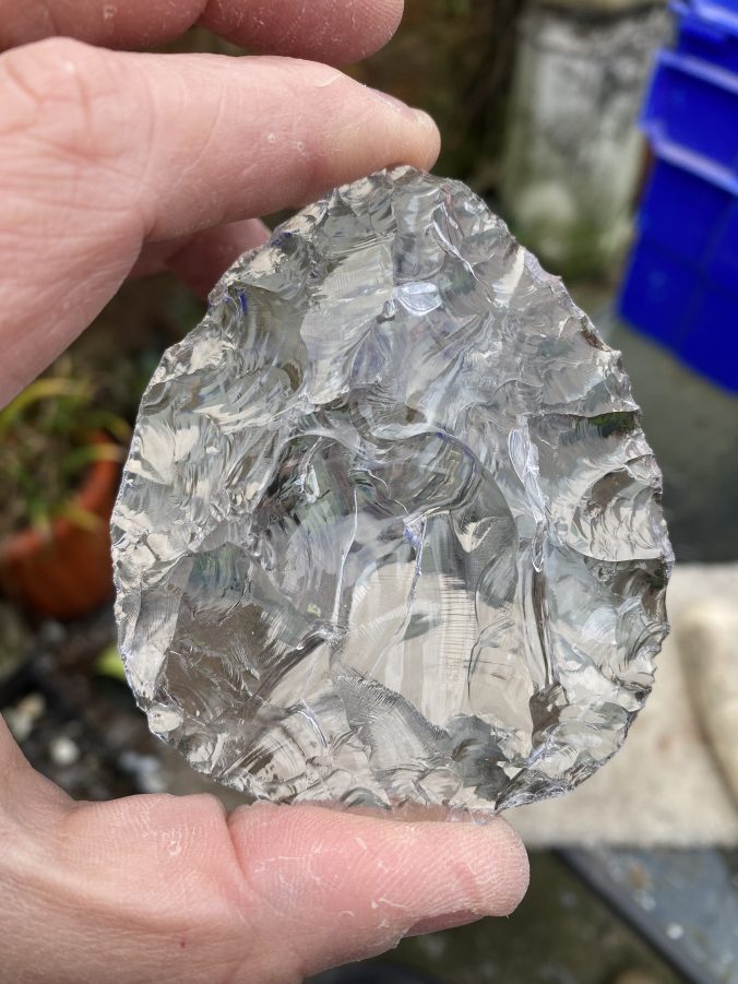 Through this process I have initiated new connections at both the Universities of Salford and Manchester, and strengthened relationships with established colleagues and friends at Manchester. Alice received my blue glass handaxe as a small expression of thanks. Jeremy, Ian and Lesley each got a glass arrowhead, I think Osen, Clare, John, Graham and Paul each warrant a nice flint handaxe. These feel less like obligations, and more like commissions, which means I will be making nice examples, that I feel acknowledge the value of what they have kindly done for me and the department. I suppose this is where aesthetics comes in, less a functional butchery tool, more a demonstration of skill to produce an object of perceived value, that forms a positive connection between the giver and the recipient.