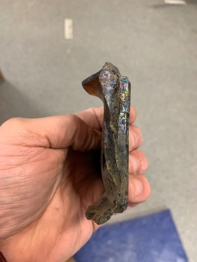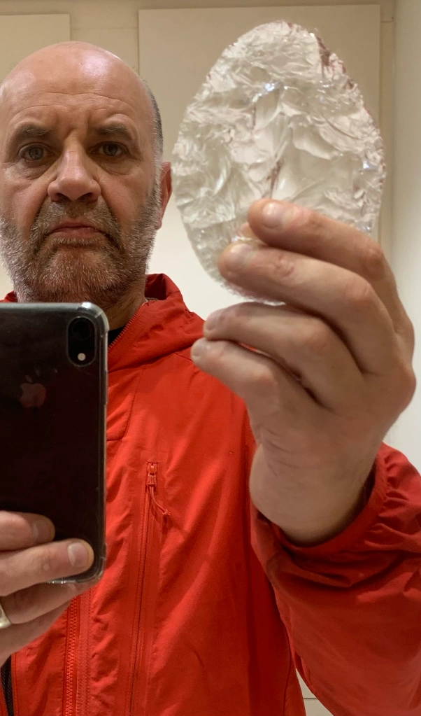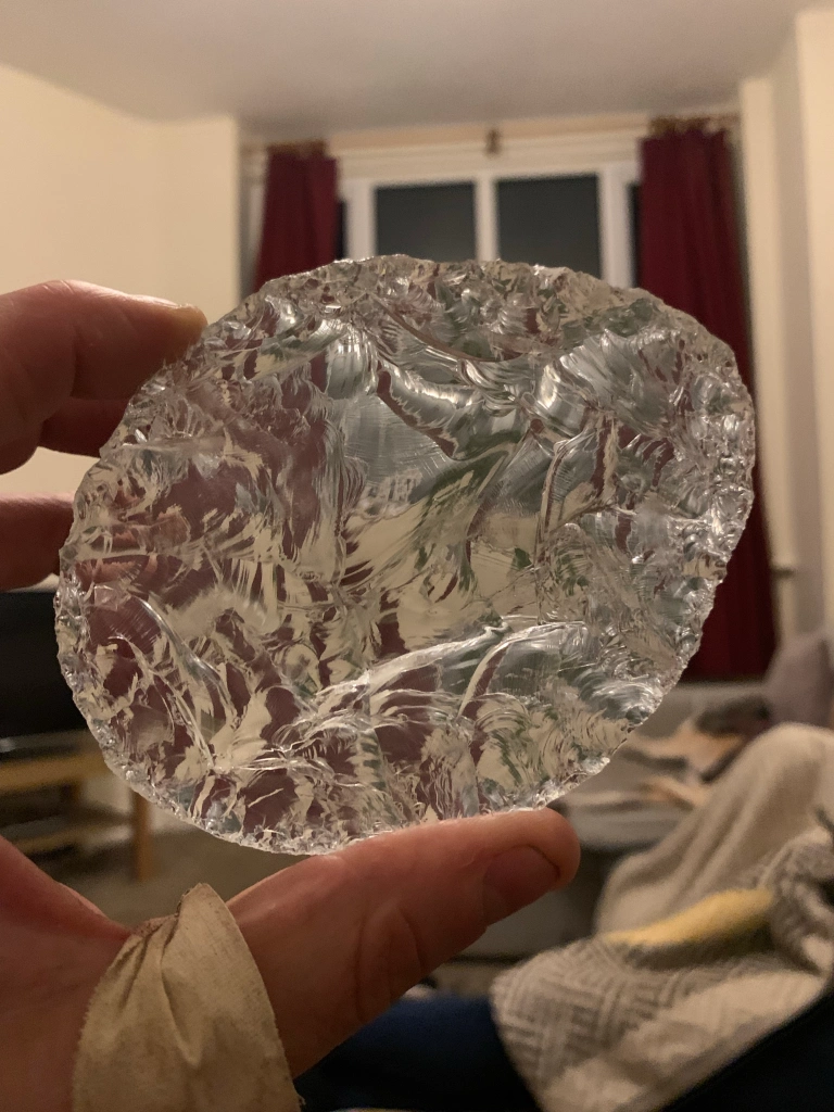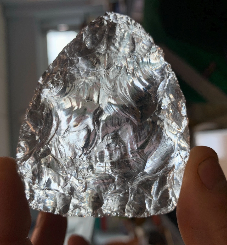 So form and potential function if you like, mirror a Palaeolithic handaxe. However, the material it is made from, a slag glass block excavated from a factory in Manchester, anchors it very much in the modern industrial period. It has two, temporally contradictory etic heritages, or narratives captured within one beautiful object.
