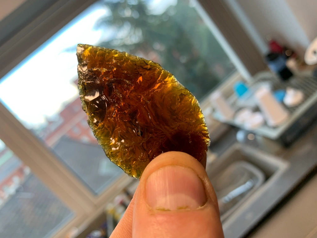 Onto handaxes. I am really liking this most recent offering. It is made from the largest piece of slag glass kindly provided by the folks at Salford Archaeology. I have left the base as is, referencing where it has come from, and in relation to the worked section, I like the thinned serrated edge on both sides. It would make a great cutting tool, and I am super pleased with this one.