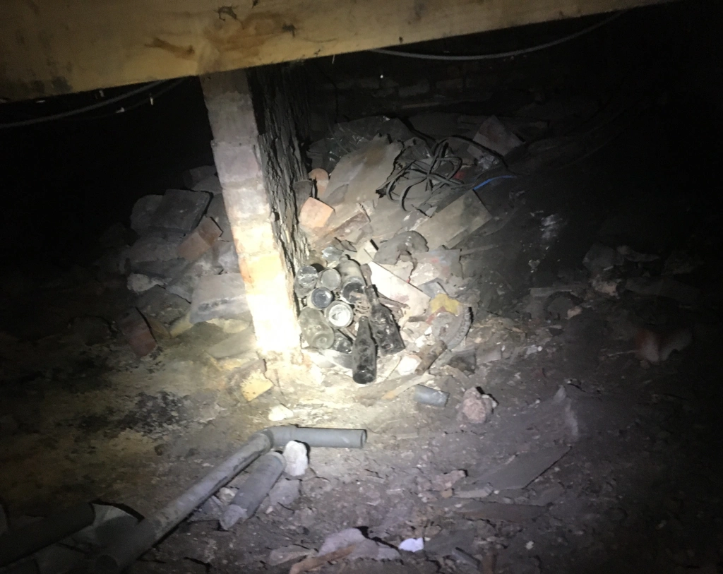 Our house was built around 1900 and used to be a corner shop. The cellar underlies less than half the ground floor, whilst the corner shop bit and the wood burner room have only a crawl space. The corner shop crawl space has an access hatch and that’s where I was today. As you can see from the above picture there is plenty of crap down there.