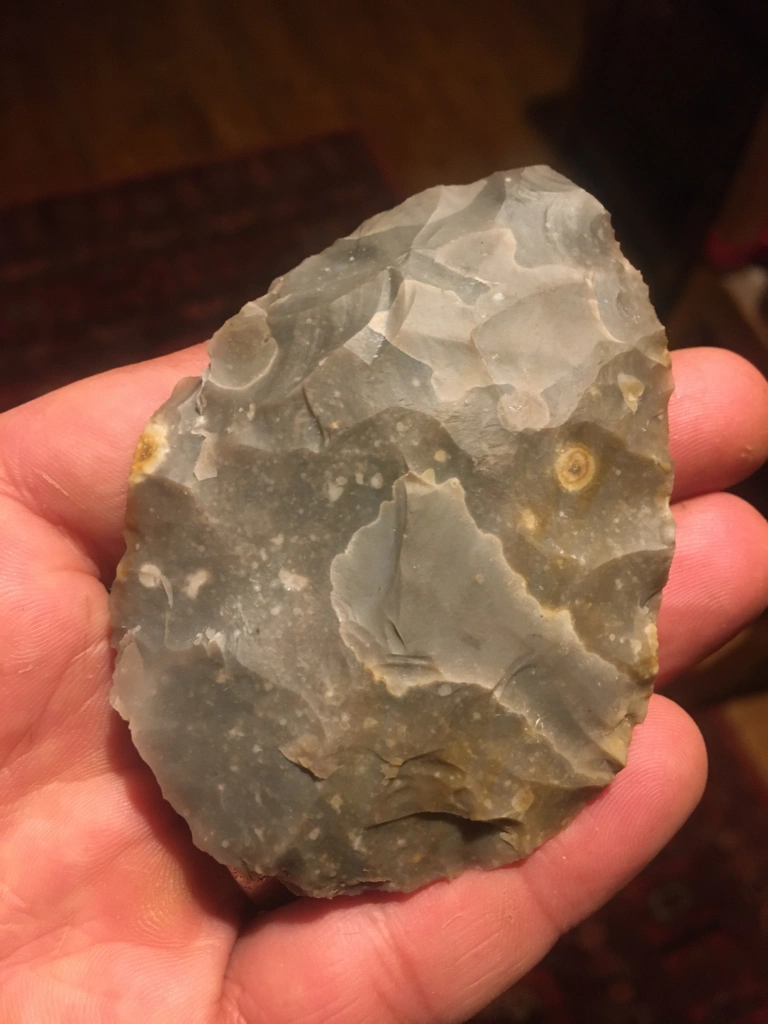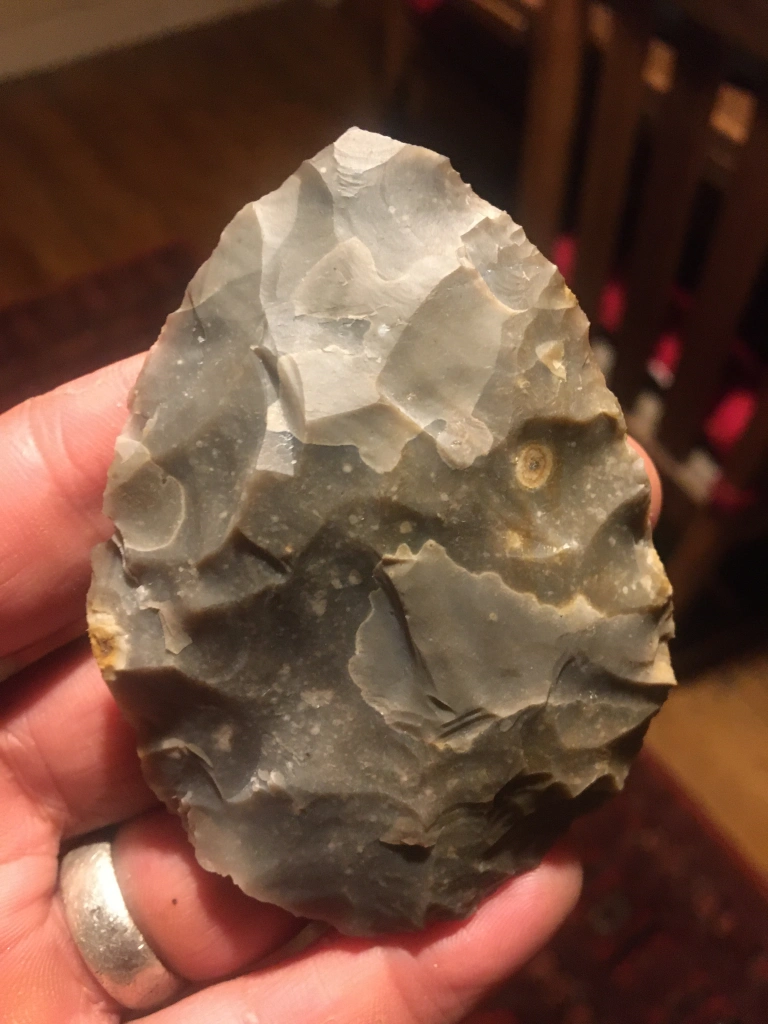 The handaxe is asymmetrical, but in a way I can live with. The edges are all sharp, but best of all, it is a double A side. Both faces are equally interesting. The first picture shows two good thinning flakes meeting in the middle, and coincidently delineating a colour and flint consistency change.