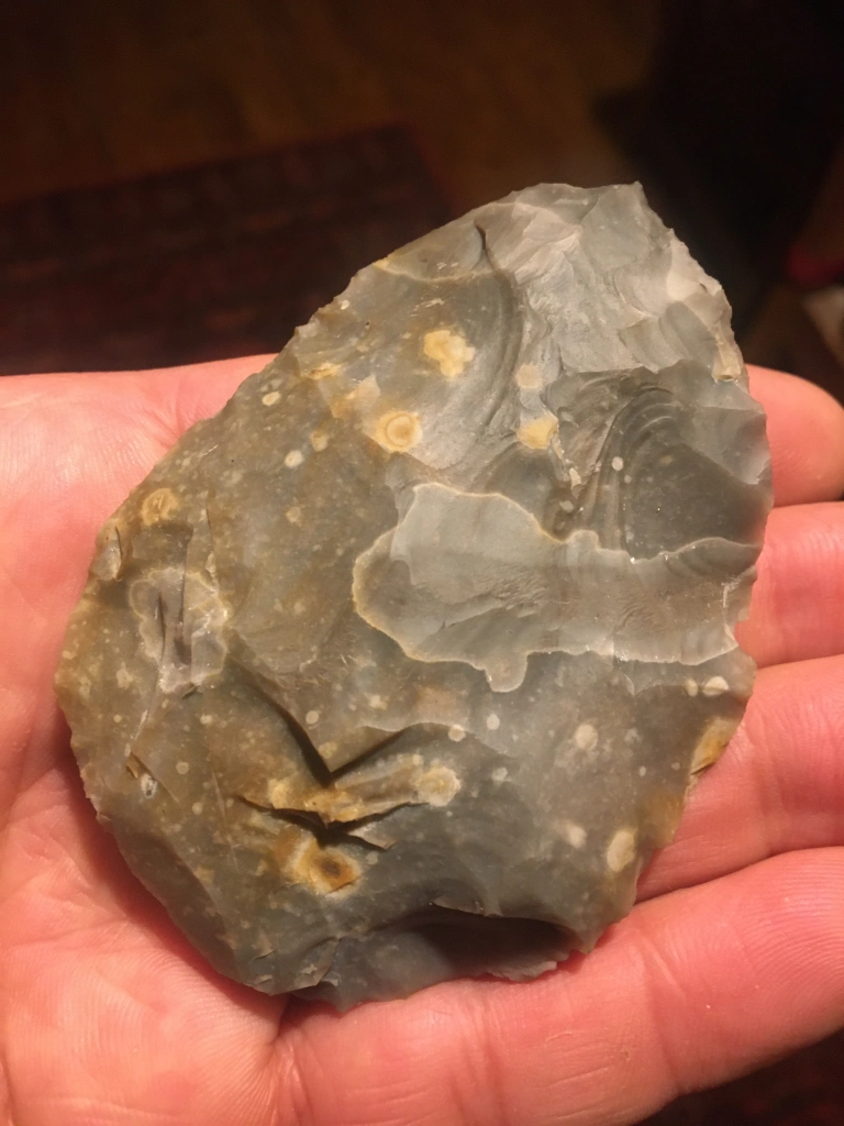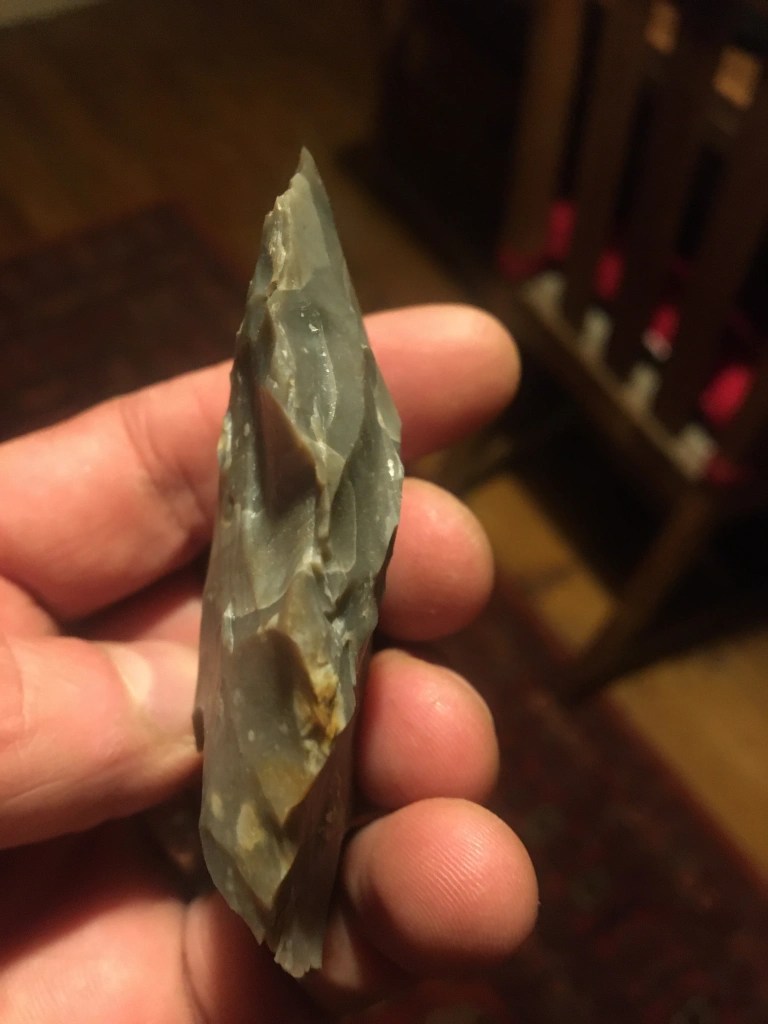 This handaxe is…hand size! perhaps a lot of the handaxe reduction process was to transform an already useful flake into a good fit with the hand. None of the above handaxe characteristics were planned above and beyond thinking about bifacial reduction. And on that note, back to scheduling