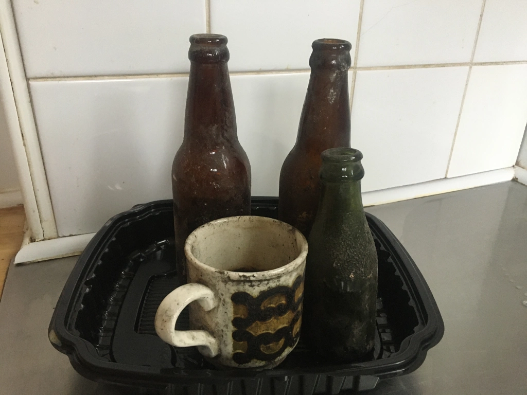 Including some complete 1970s beer bottles and an undamaged jazzy cup. I brought three bottles and the cup out and left a nest of the rest for some future explorer. No obvious leak, but I did clad all the hot water pipes with insulation which I am happy about.