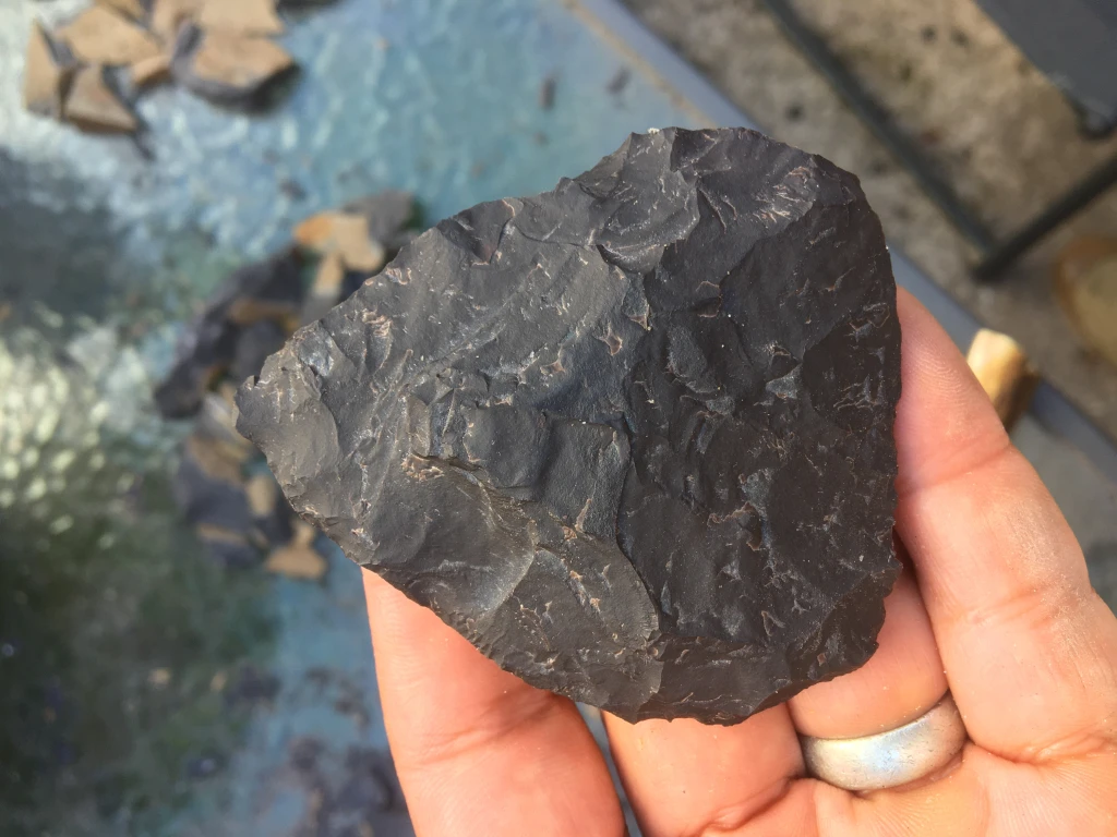 With the final stage I really had to hit the material hard with the small antler hammer. A bigger one would have worked better, but my approach succeeded and I did manage to get some nice soft hammer flakes off. As you can see, these are characterised by minimal cortical surface present.
