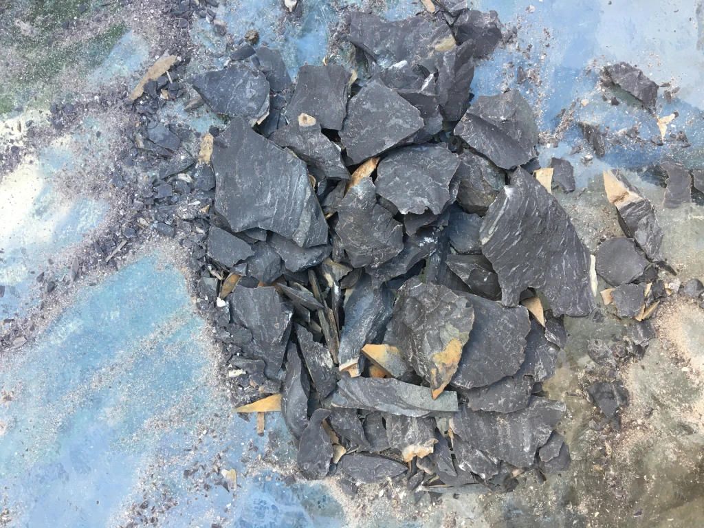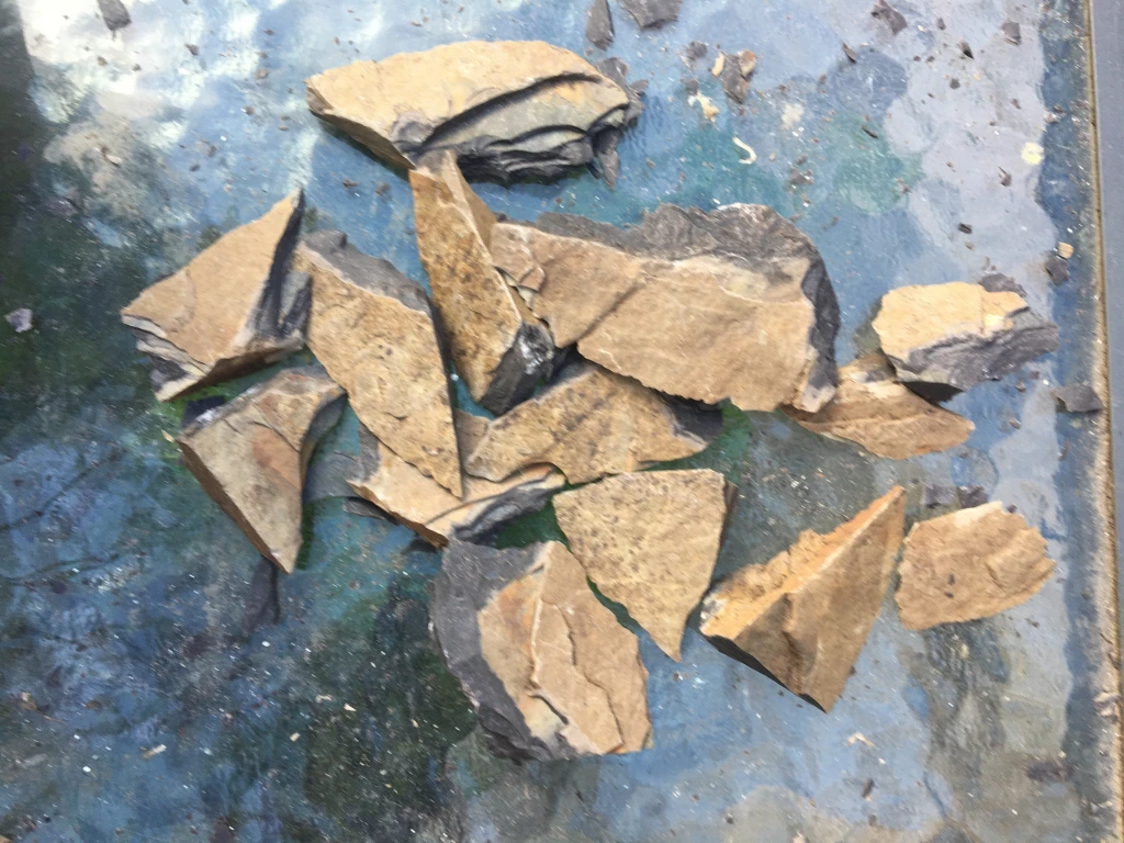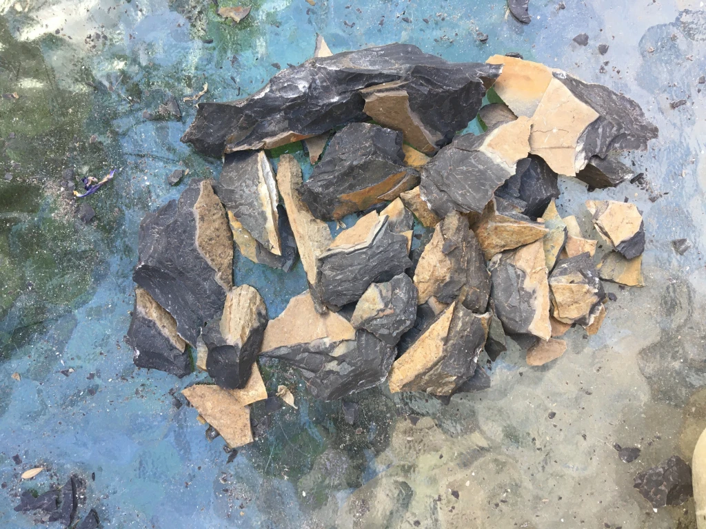 Anyway, I was at home and most of my knapping gear is at work and I was feeling a little bit stressed and saw a nice tabular piece of material in the back yard. I am 99.9% sure I picked it up at the Mynydd Rhiw site earlier this year, but my problem was that I only had a very large and very small hammerstone to hand, and a small antler hammer that I usually use on glass. None of the tools were ideal but I wanted to have a go, and if my above theoretical understanding was correct, I should be able to adapt my speed of hitting to compensate for the overly large or overly small size of the tools being used.