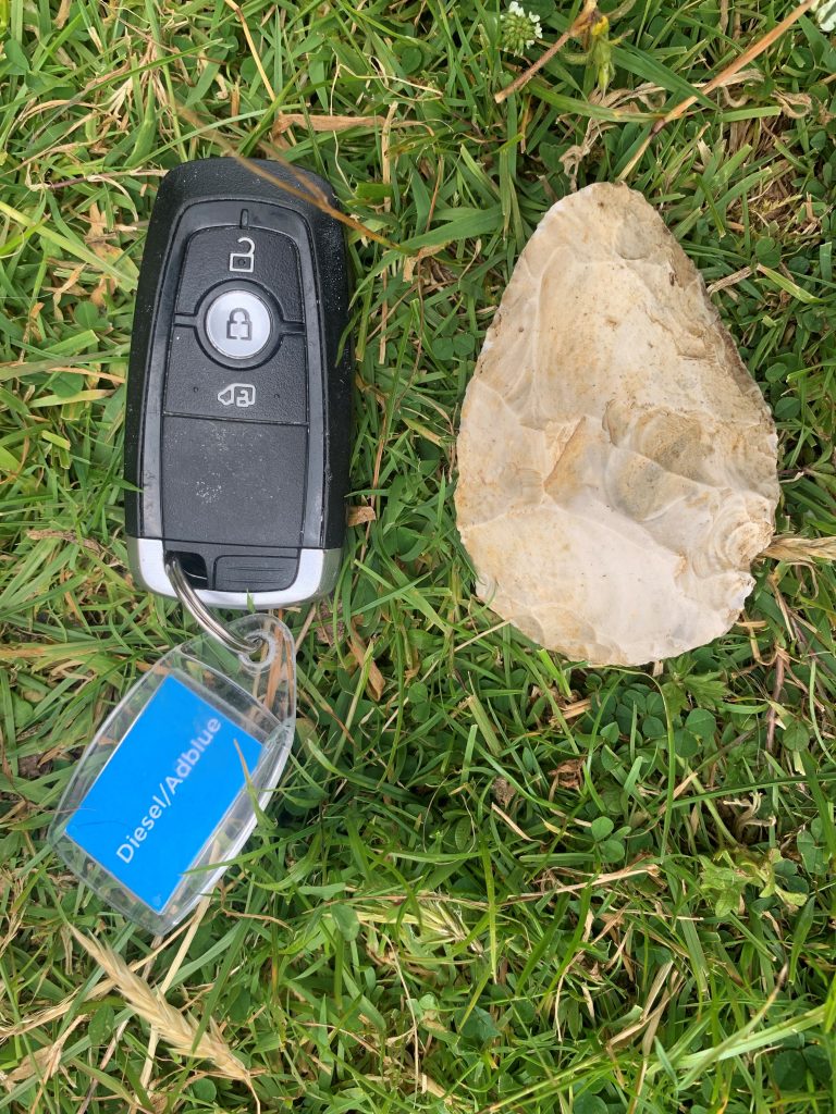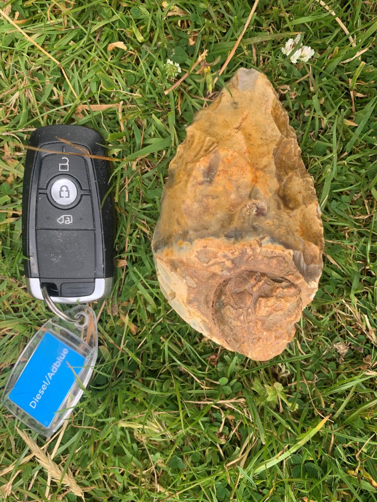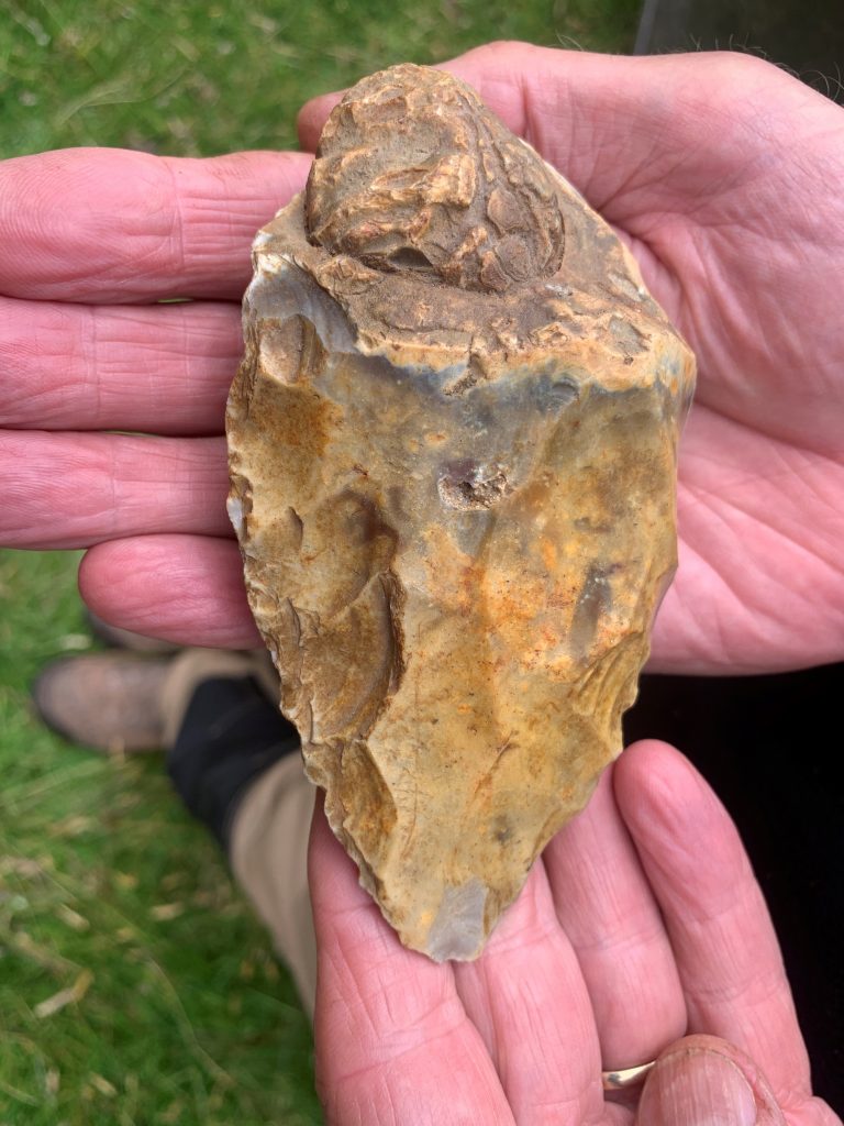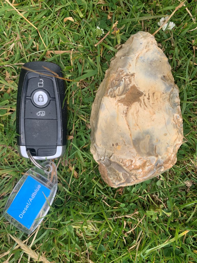 As can be seen with these two photographs, the patina, or colour on one face is different to that on the other. This indicates that it has been sat for a considerable length of time and the lower surface has patinated at a different rate to the exposed upper surface. The edges are in good condition and indicate that it has not been rolled around much if at all. Like the one we have, it is in very good condition. White, Ashton and Bridgland (2019 open access) looked at the recorded contexts of this particular type of handaxe in Britain and dated them to around Marine Isotope Stage 11, so around 400,000 years ago.