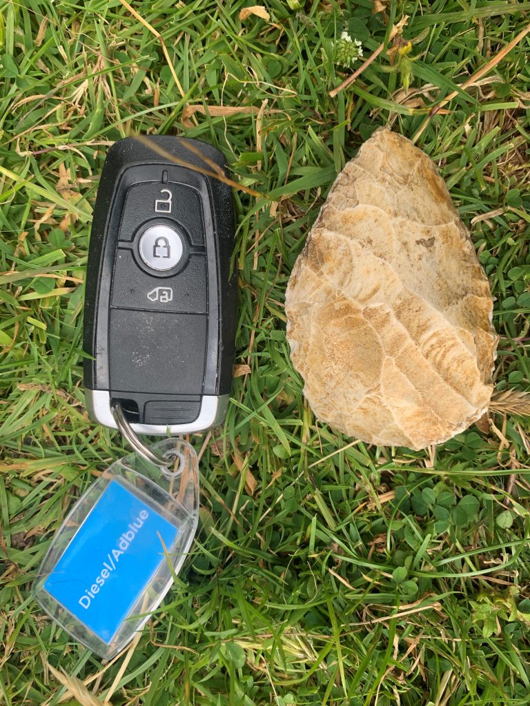 Moving onto different reasons, the echinoderm in the room is the amazing fossil sitting at the top of the photograph below. I sent a picture of it to my Geology friend, Stephen Poole, and he got back to me with the term: echinoderm. A number of well known handaxes have fossil inclusions and this has led to debates about evidence for Palaeolithic aesthetics. The most recent paper I read (Flanders & Kay 2023) argues that with the famous West Tofts example, it was simply left in because it would have been difficult to remove. I have discussed similar in a previous post.