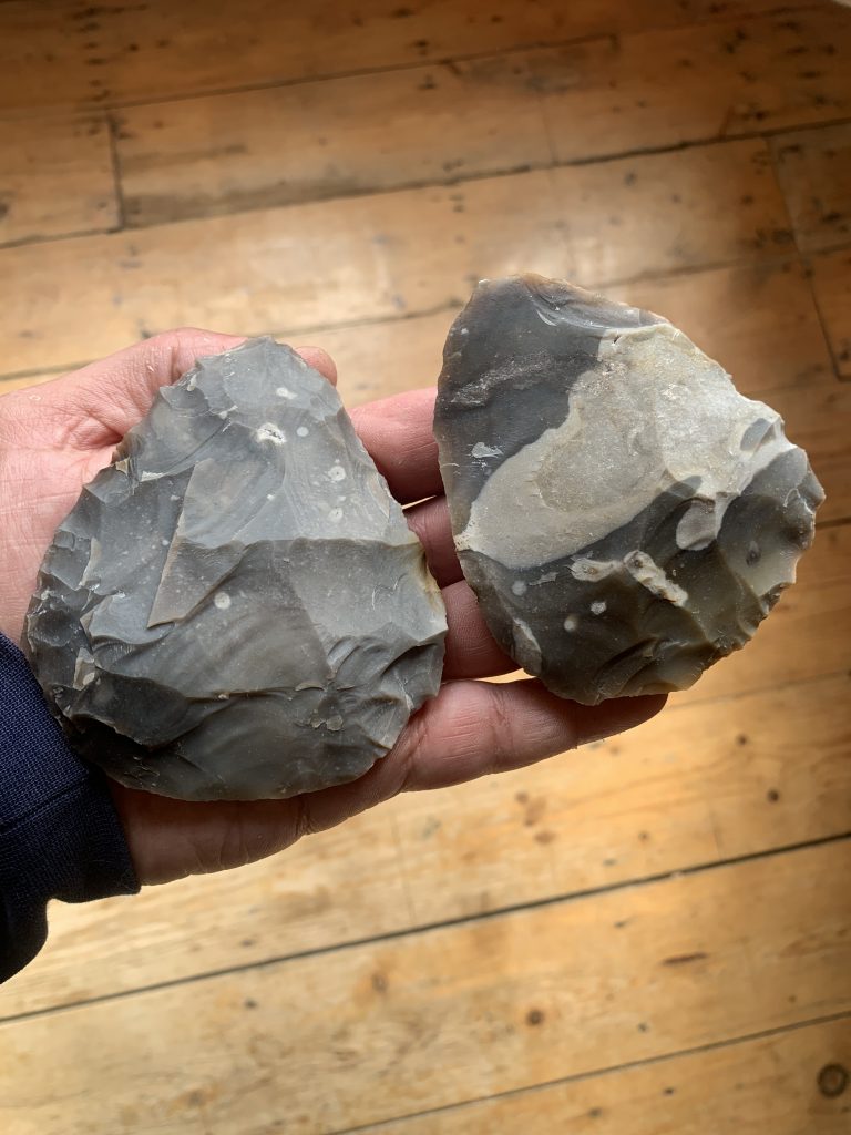 I have been making quite a few handaxes recently, but only just detected that I have a style. It occured to me when I saw these two next to each other and recognised how similar they are. Shape and size was an obvious similarity, and so these two can be recognised as the same ‘type’, and that would be cordate, or heart shaped.